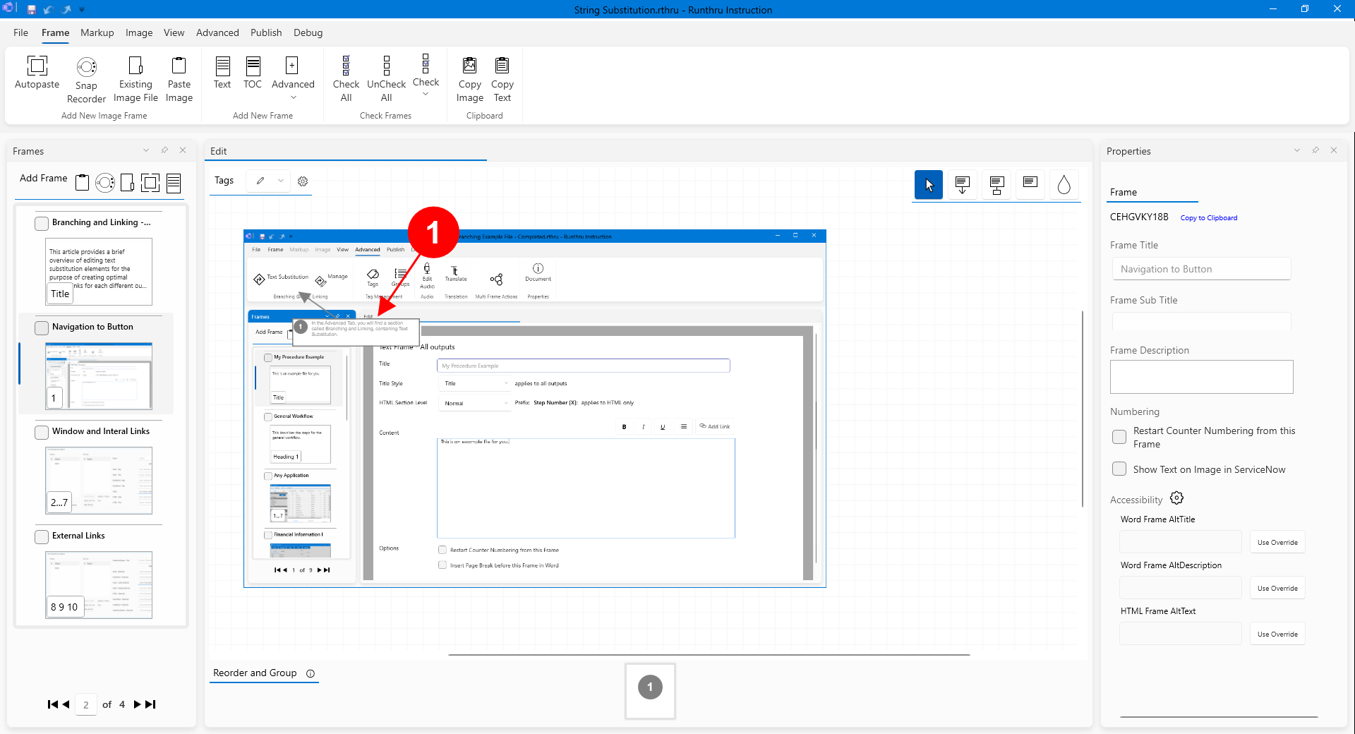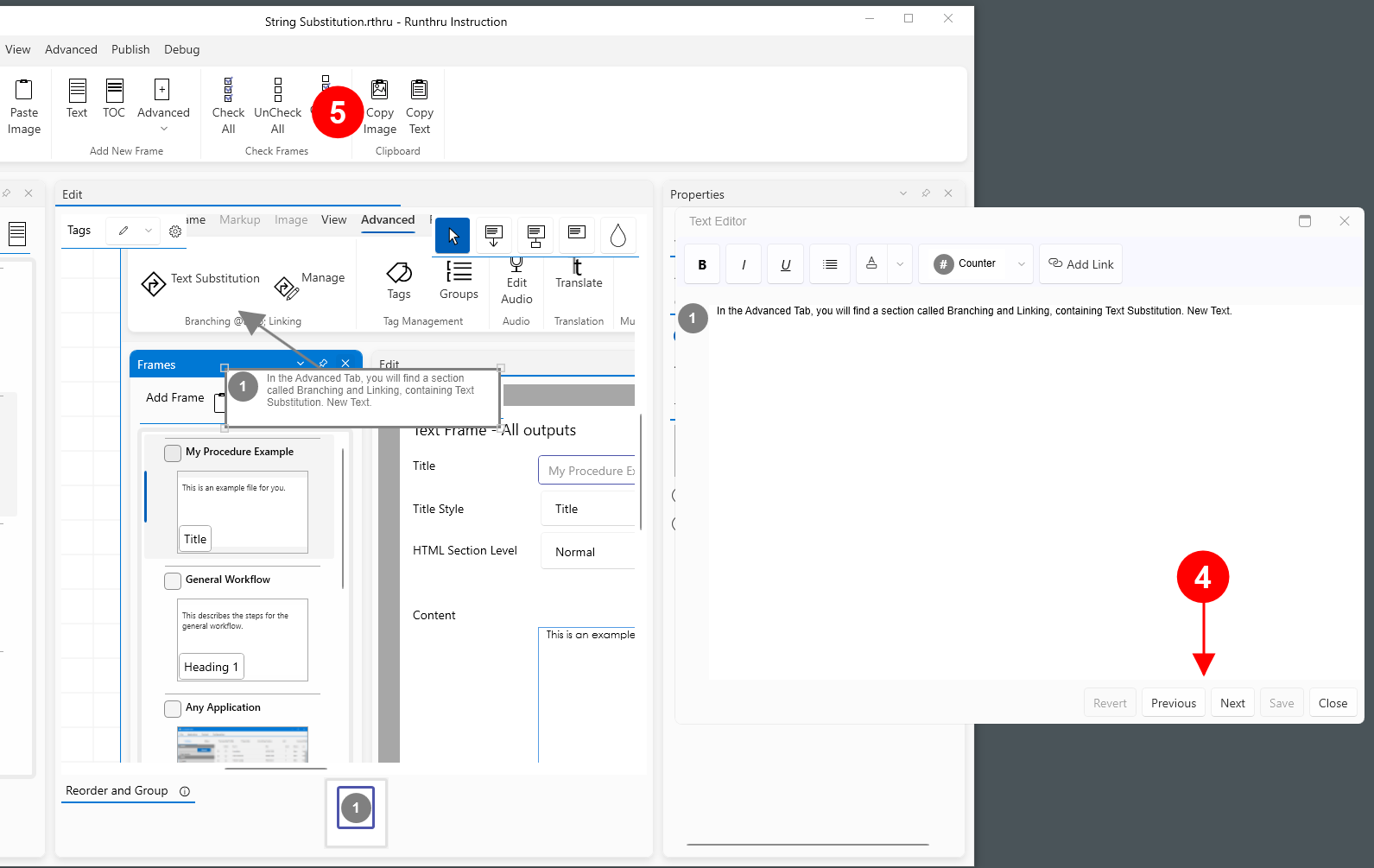 On this image you can see Runthru Instruction on the left, displaying Step 1. On the right is the Text Editor open to Step 1.