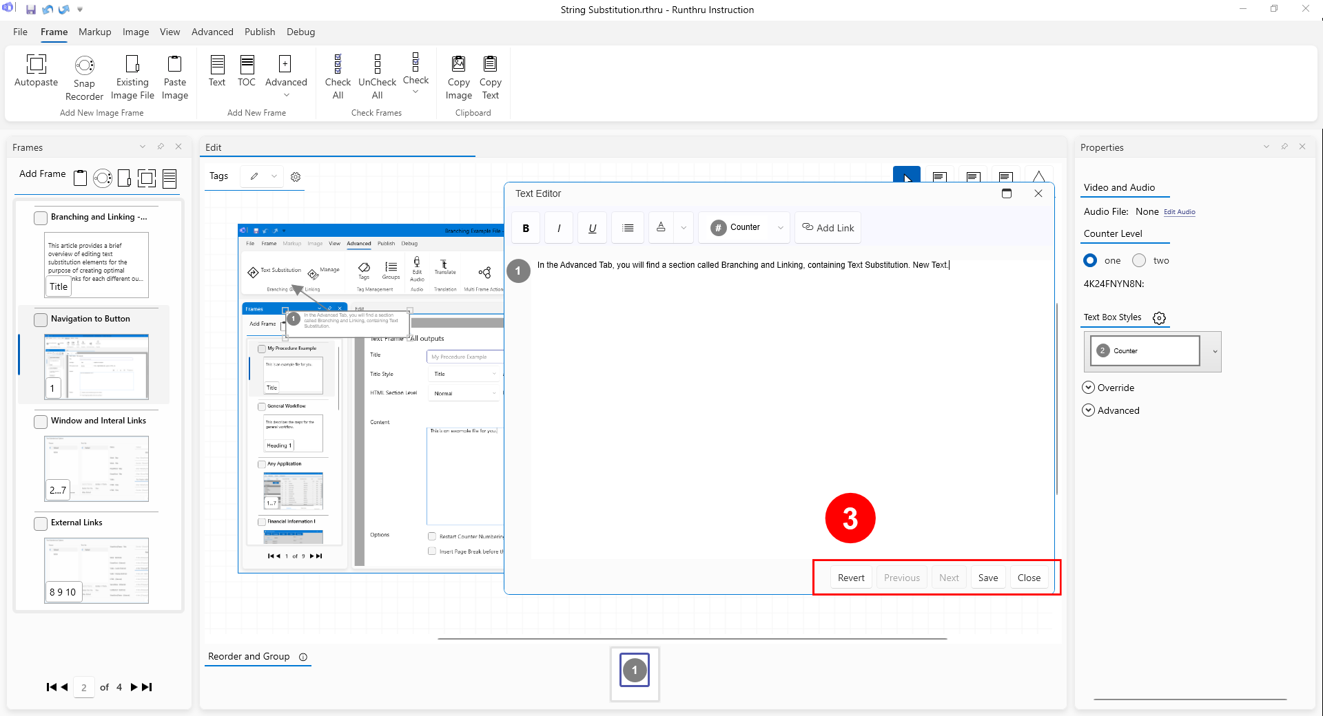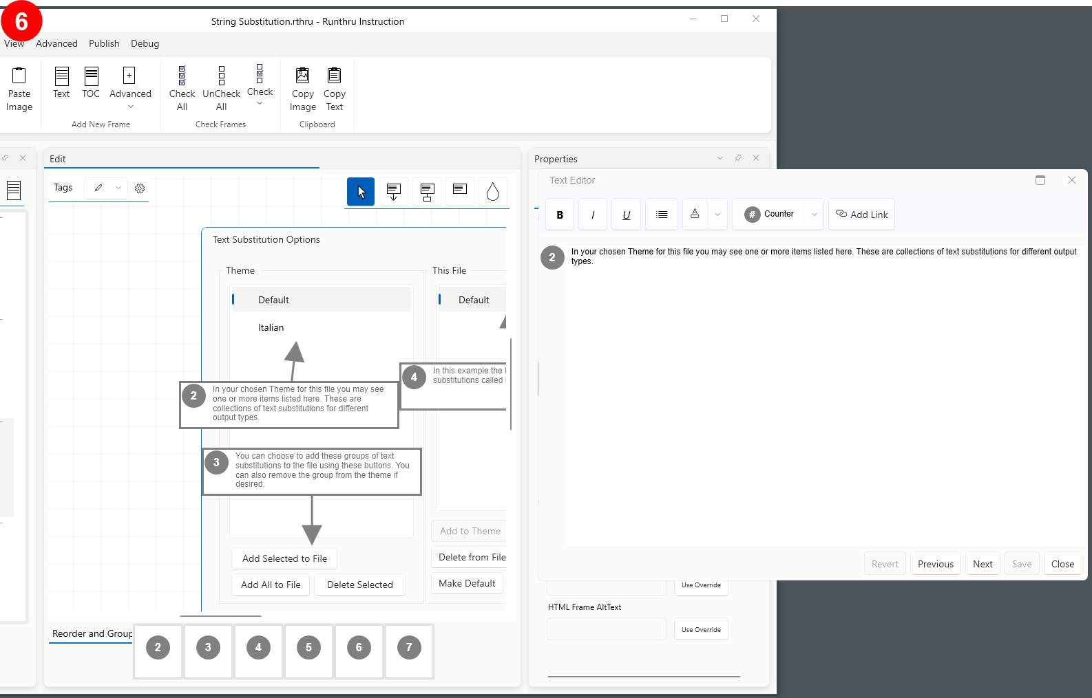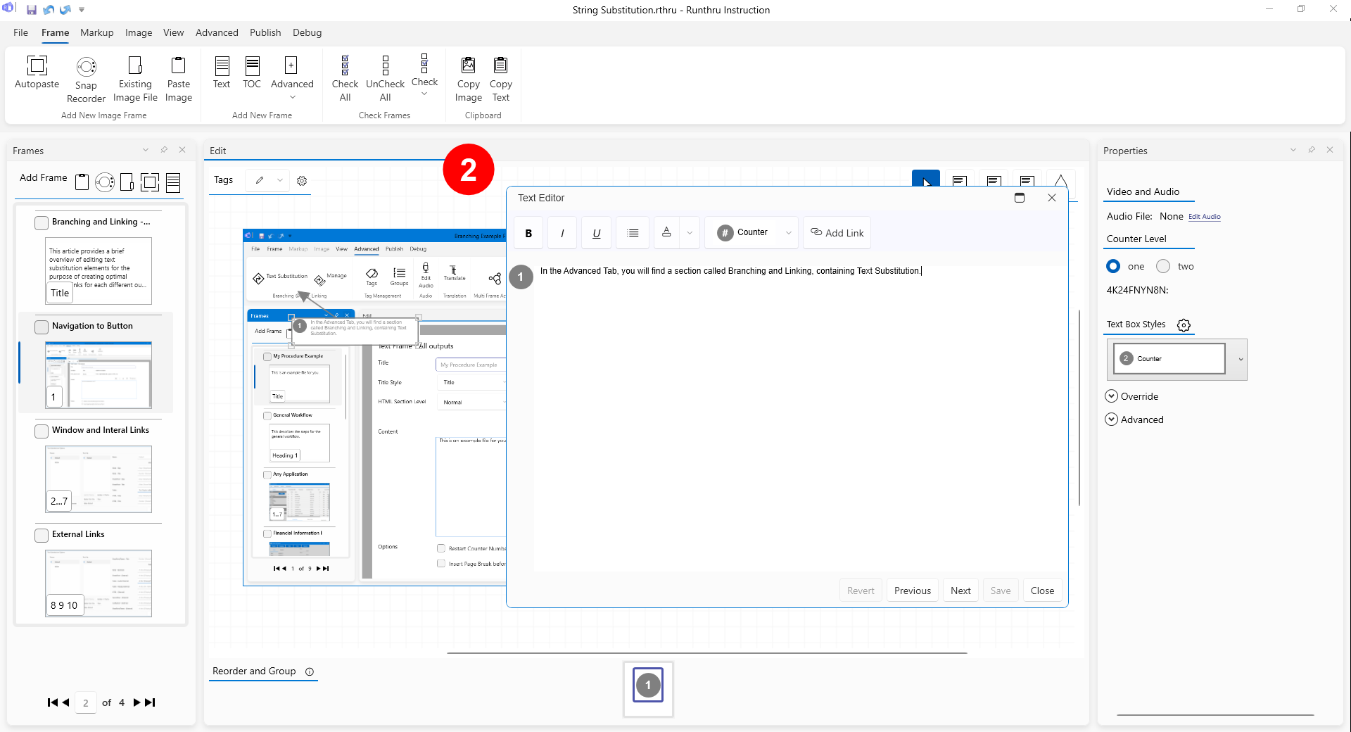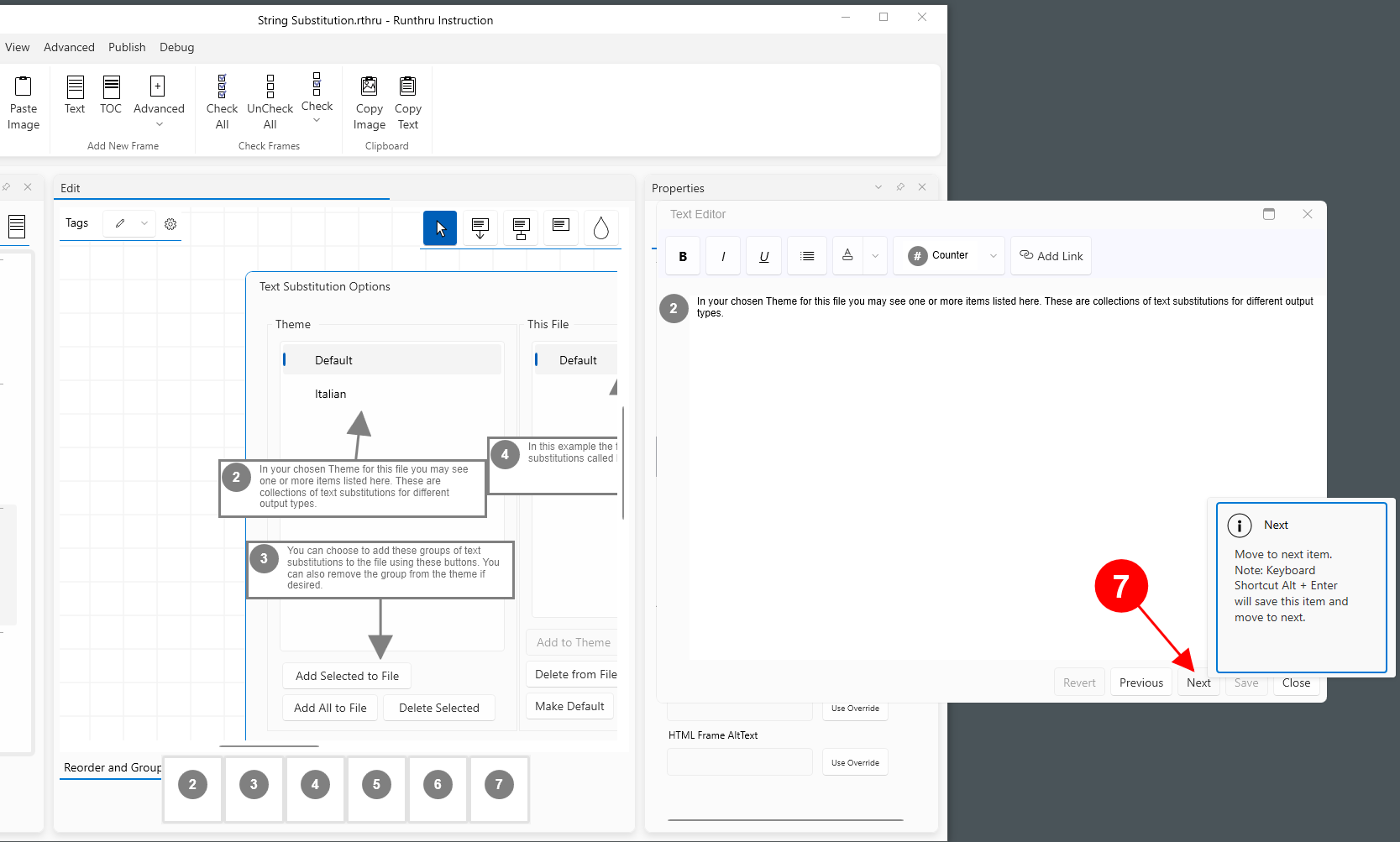 Clicking the Next button navigates the Text Editor and the visible item in the main window to Step 2.