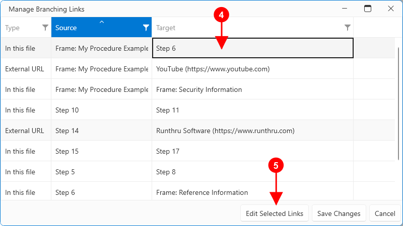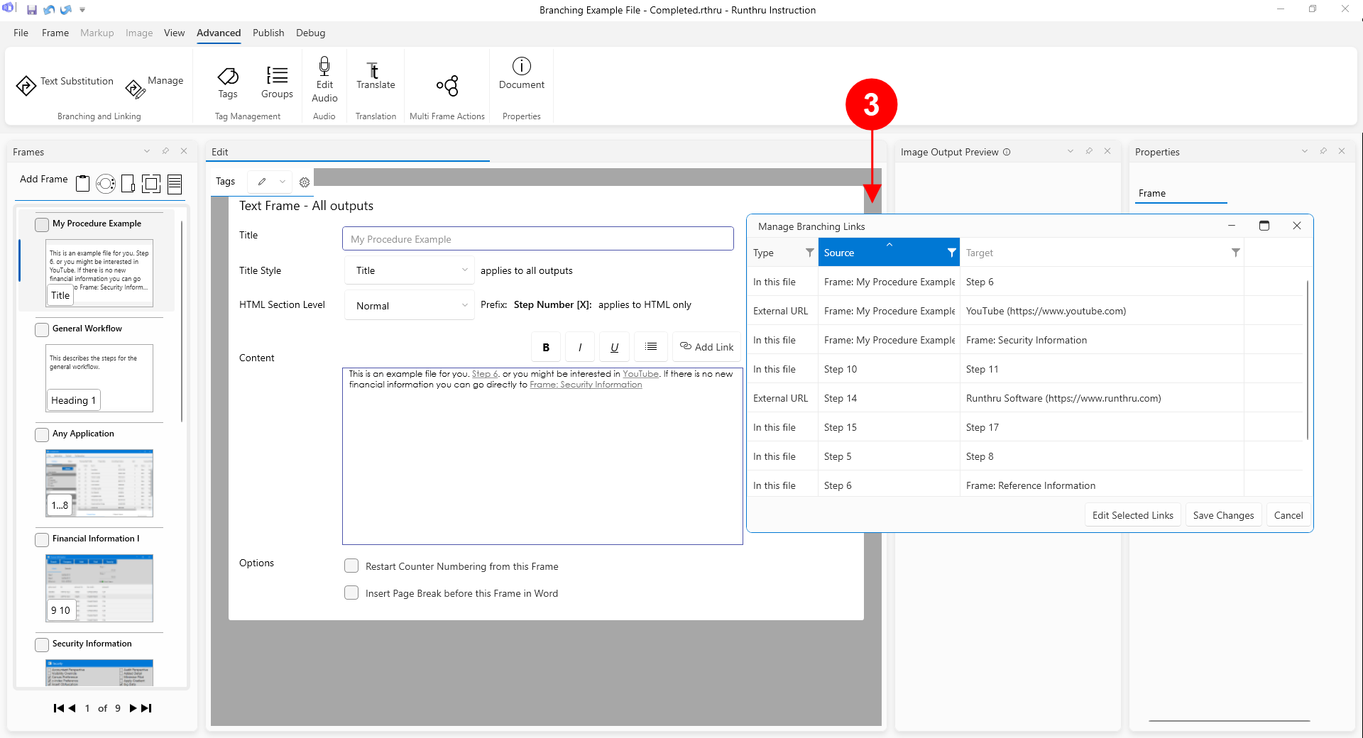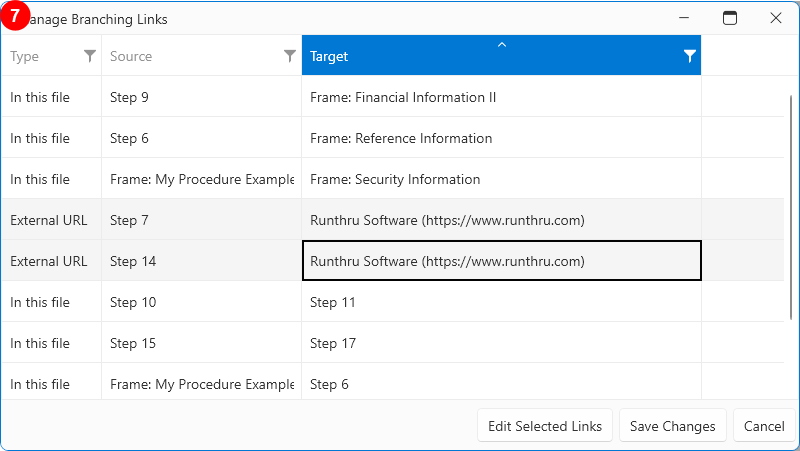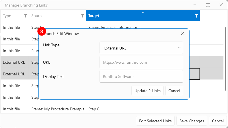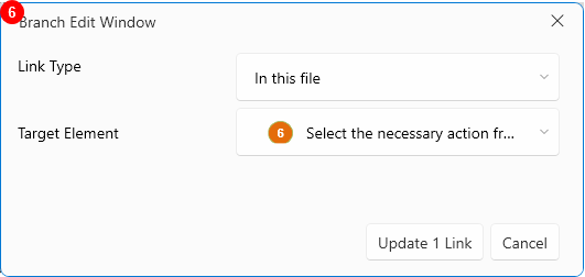 This opens the Manage Branching Links window. This window contains all the links in your document.