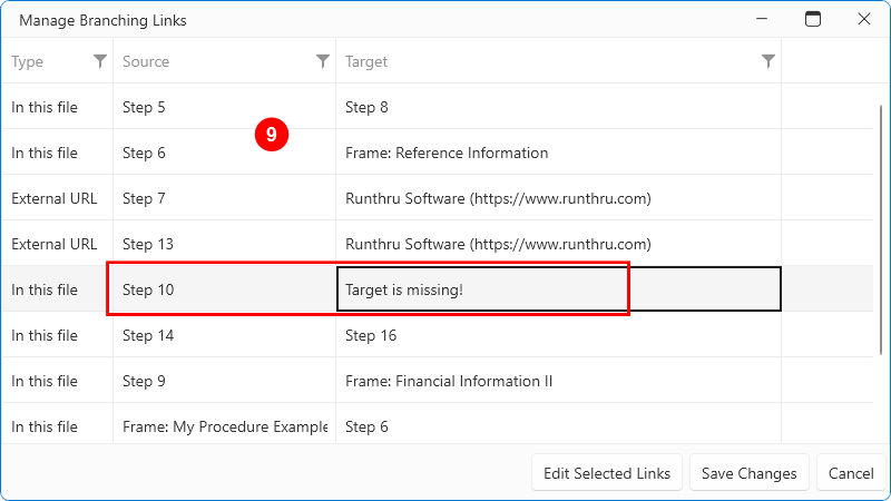 If a target is missing, such as in this example where Step 11 has been removed. A warning is shown, and the update can be made here as above.
