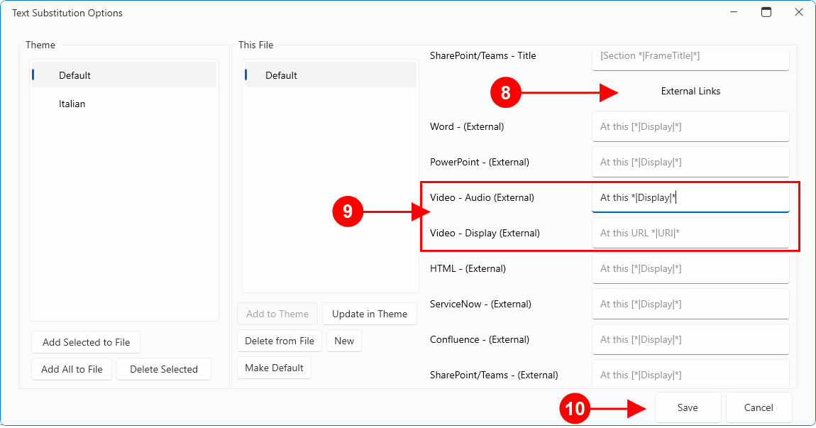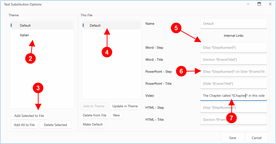 You can choose to add these groups of text substitutions to the file using these buttons. You can also remove the group from the theme if desired.