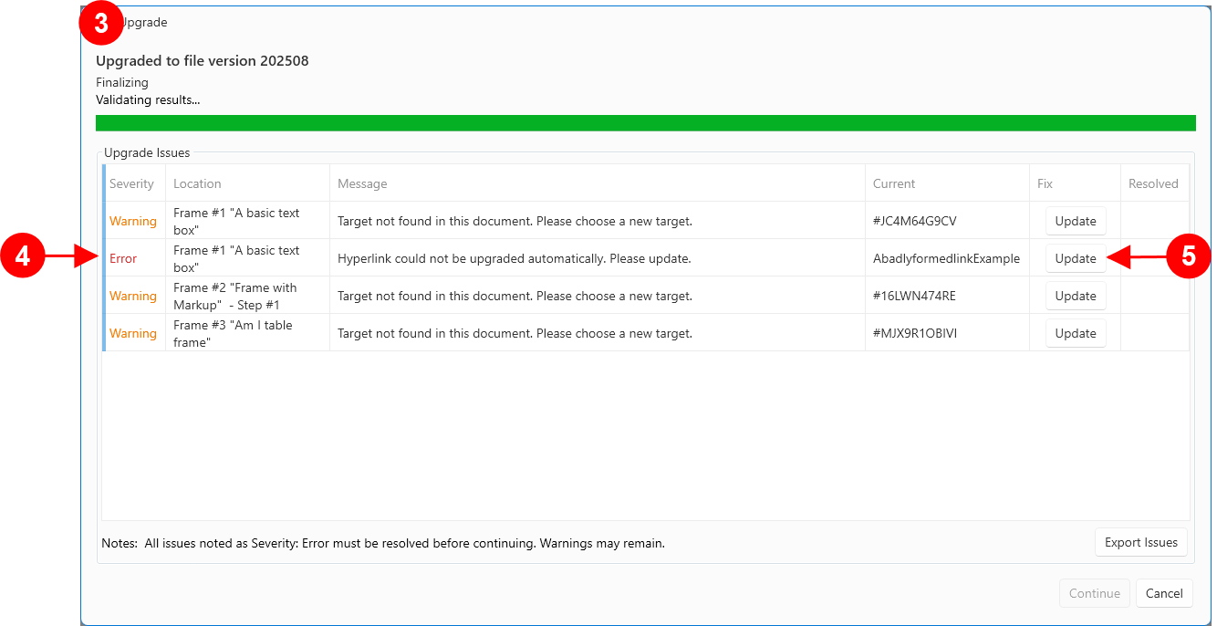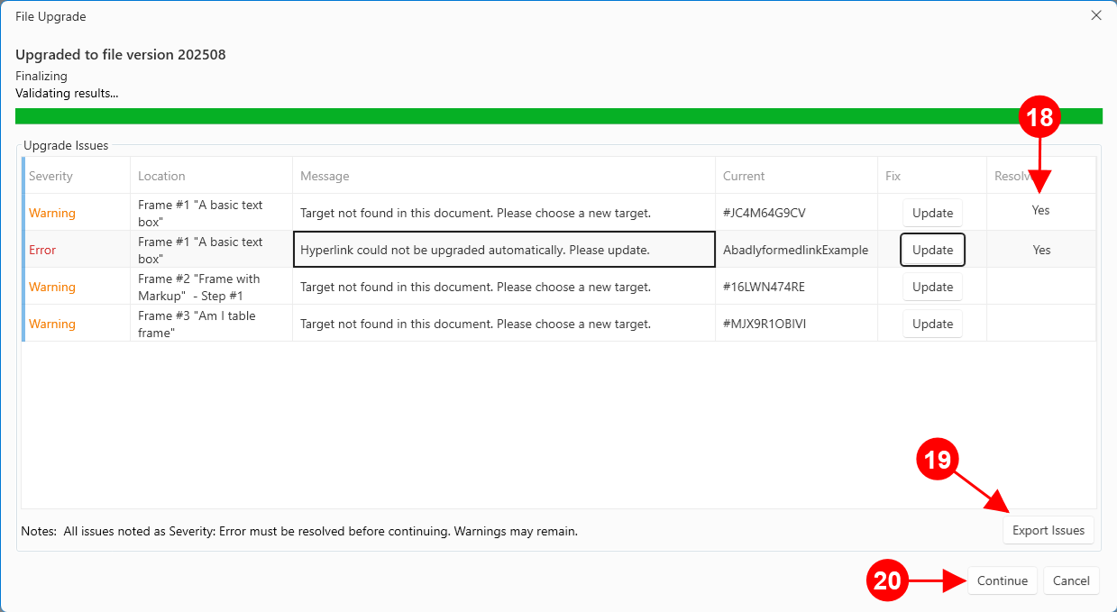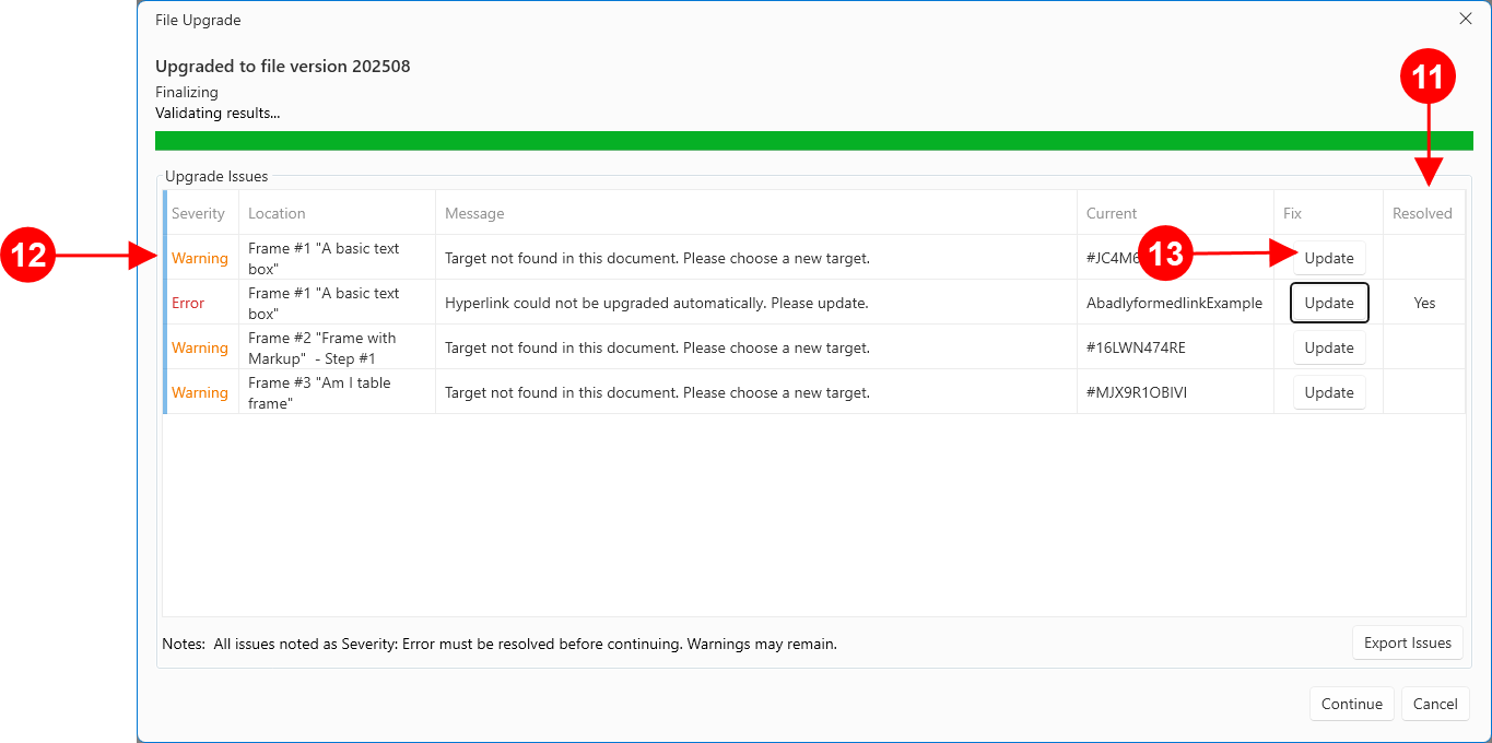 If all the Errors are resolved, and the desired Warnings are resolved, you can press Continue to complete the opening of your upgraded file.
