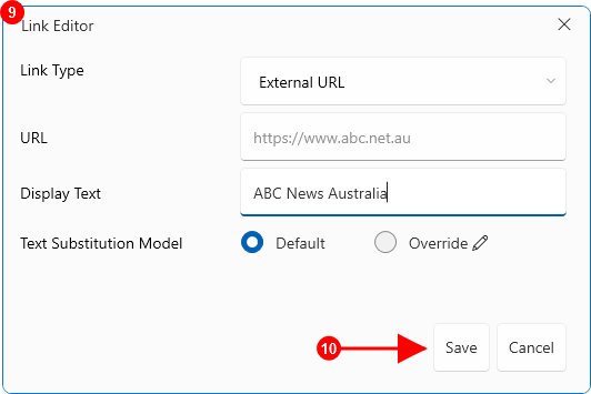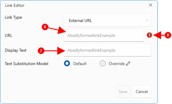 The Link Editor shows a correctly formed URL (there is no warning icon as there was in the previous error).